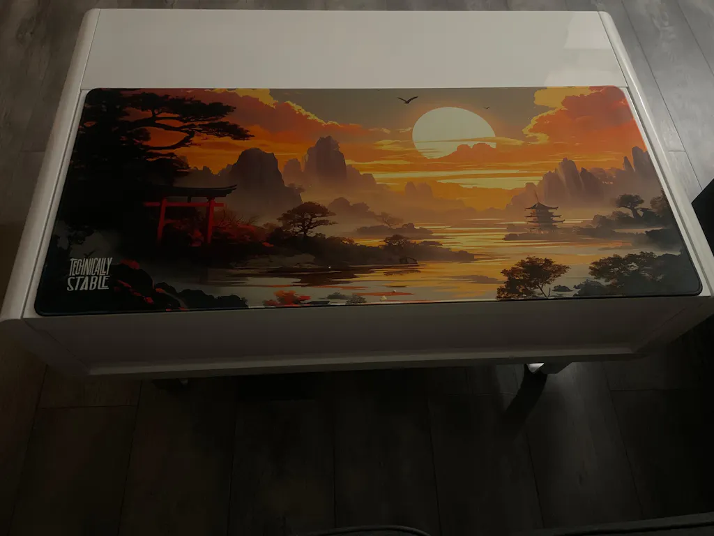 Japanese Sunset unfolds a serene Japanese landscape across a broad, smooth deskpad—designed for work, gaming, and creative tasks. Created by Technically Stable in the UK, it blends immersive art with a reliable surface that keeps you focused and comfortable.