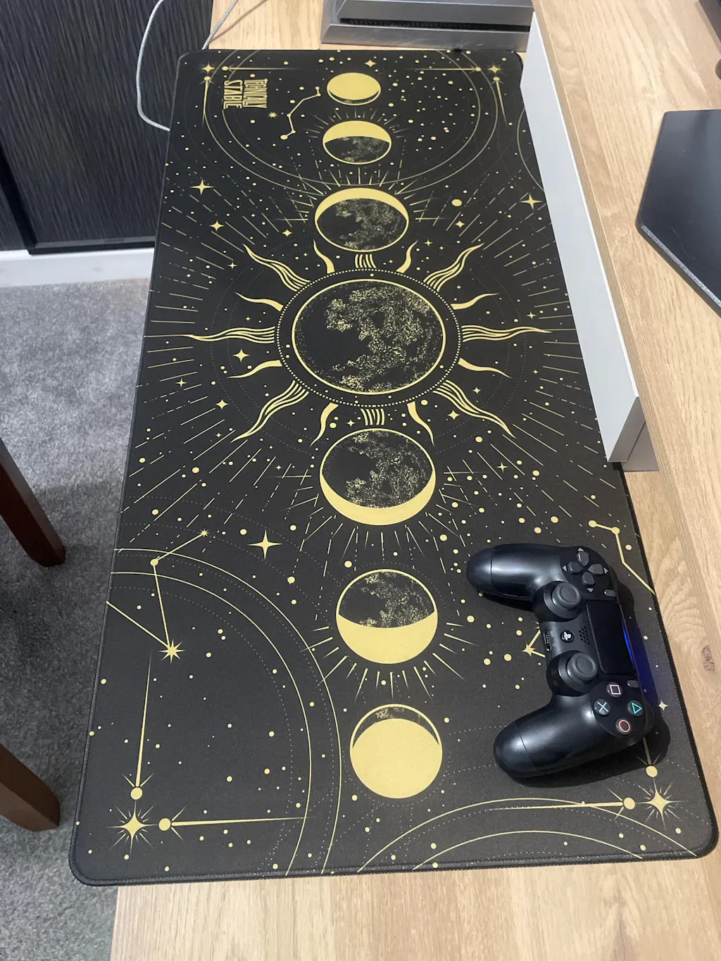 - Celestial design: A gold moon-phase procession runs across a deep, space-themed backdrop, creating a dramatic focal point on any gaming or work desk.