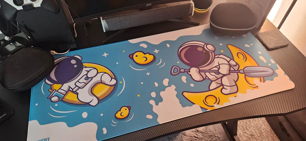 Space Duck Soup is a space-themed deskpad featuring playful astronauts and ducks on a vibrant green surface. Built for gamers and productivity-focused setups, it blends bold artwork with a practical, smooth surface that keeps your mouse gliding and your keyboard comfortably in place.